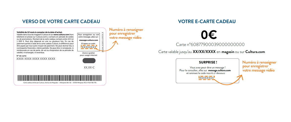 Pour enregistrer votre message, vous devez vous rendre sur le site  https://message.cultura.com/  et entrer le code présent sur votre carte ou e-carte cadeau.